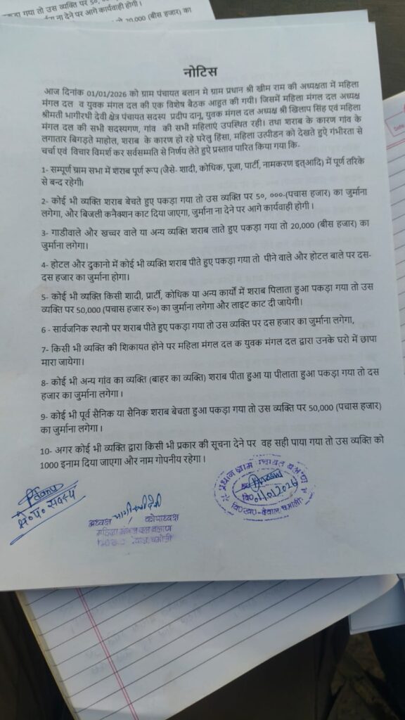 साथ ही ग्रामीणों ने यह भी निर्णय लिया कि सार्वजनिक स्थानों पर शराब पीते हुए कोई व्यक्ति पकड़ा गया तो उस व्यक्ति पर ₹10000 का जुर्माना लगाया जाएगा।