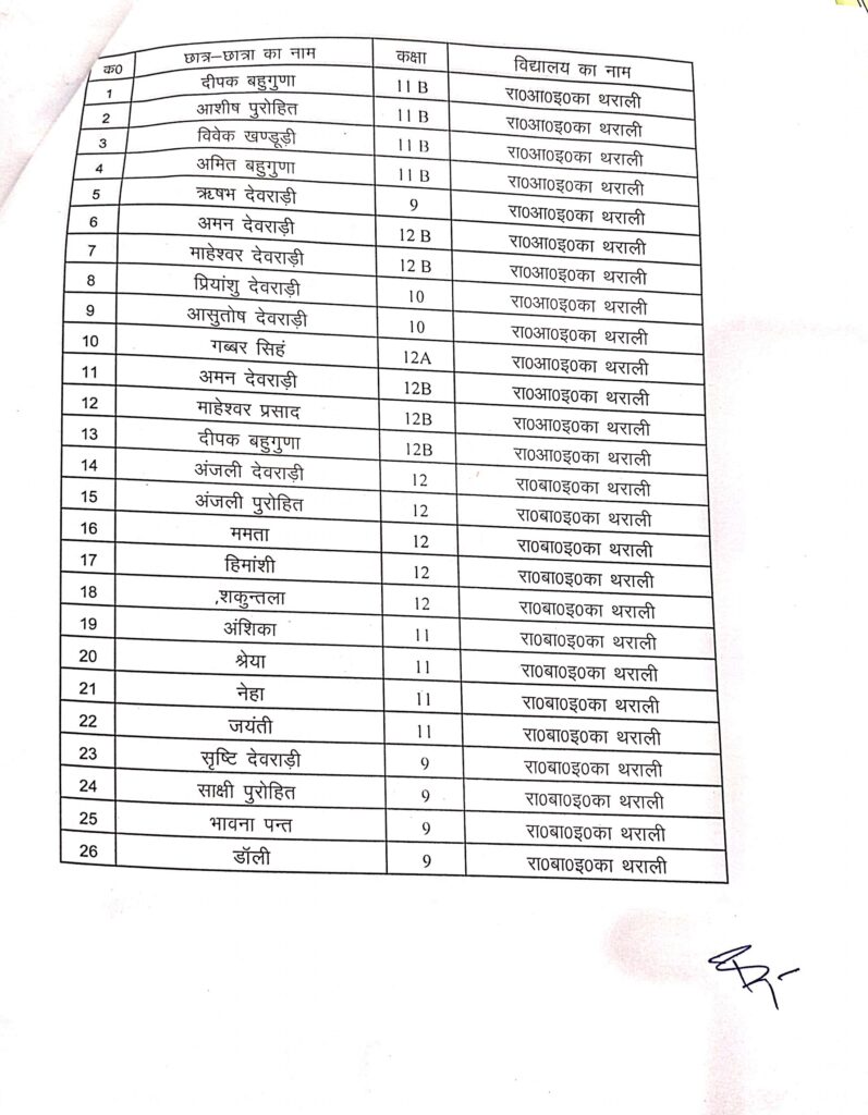 कक्षा 1 से कक्षा 12 तक कुल 26 छात्र -छात्राएं थराली नगर के अलग-अलग विद्यालयों में पढ़ते हैं,जिसमें राजकीय आदर्श इंटर कॉलेज थराली से दीपक बहुगुणा, आशीष पुरोहित, विवेक खंडूरी, अमित बहुगुणा जो कक्षा 11 बी के छात्र हैं, ऋषभ देवराड़ी कक्षा 9,अमन देवराड़ी, माहेश्वर देवराड़ी, प्रियांशु देवराड़ी, आशुतोष देवराड़ी, गब्बर सिंह, अमन देवराड़ी, माहेश्वर प्रसाद , दीपक बहुगुणा, तथा राजकीय बालिका इंटर कॉलेज थराली से अंजलि देवराड़ी, अंजली पुरोहित, ममता,हिमांशी, अंशिका, श्रेया, नेहा, जयंती,सृष्टि देवराड़ी साक्षी पुरोहित,भावना पंत, डोली की कक्षाएं सूना गांव में ही संचालित की जाएगी।