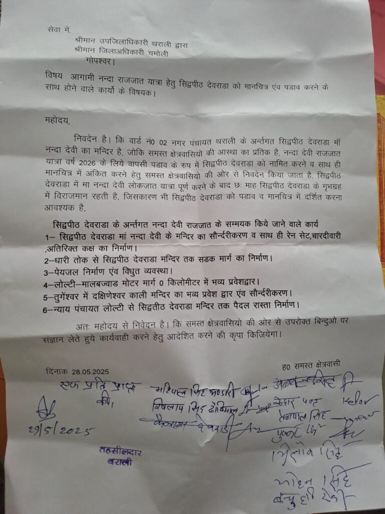 उन्होंने ज्ञापन में वर्ष 2026 में होने वाली हिमालयी महाकुंभ नंदा राजजात से पूर्व सिद्धपीठ देवराडा को पड़ाव घोषित करने तथा पर्यटन मानचित्र में दर्शाने की मांग की है।