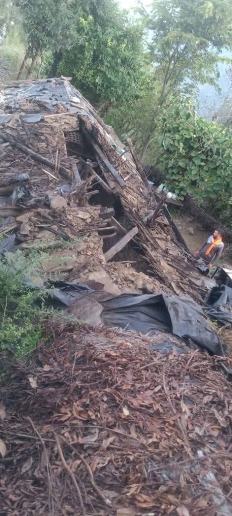 दरवाजे से नहीं छत को पूरी तरह उखाड़ता है यह जानवर नीमा देवी की छत पर भारी भरकम पत्थरों को उखाड़ने के बाद मजबूत चीड़ के बांसों को उखाड़ कर छत तोड़ा और फिर यहीं से भागा।