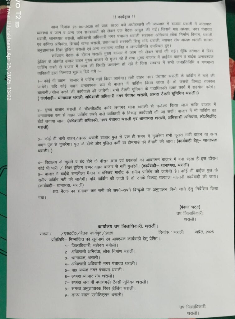 1- कोई भी वाहन बाजार में पार्किंग नहीं किया जाएगा, सभी वाहन नगर पंचायत थराली के पार्किंग में खड़े किए जाएंगे, यदि कोई वाहन अनावश्यक रूप से बाजार में पार्किंग किया जाता है, तो उनके विरुद्ध तत्काल चालानी /सीज करने की कार्रवाई की जाएगी, सभी टैक्सी यूनियन के पदाधिकारी उक्त कार्य में सहयोग करेंगे।