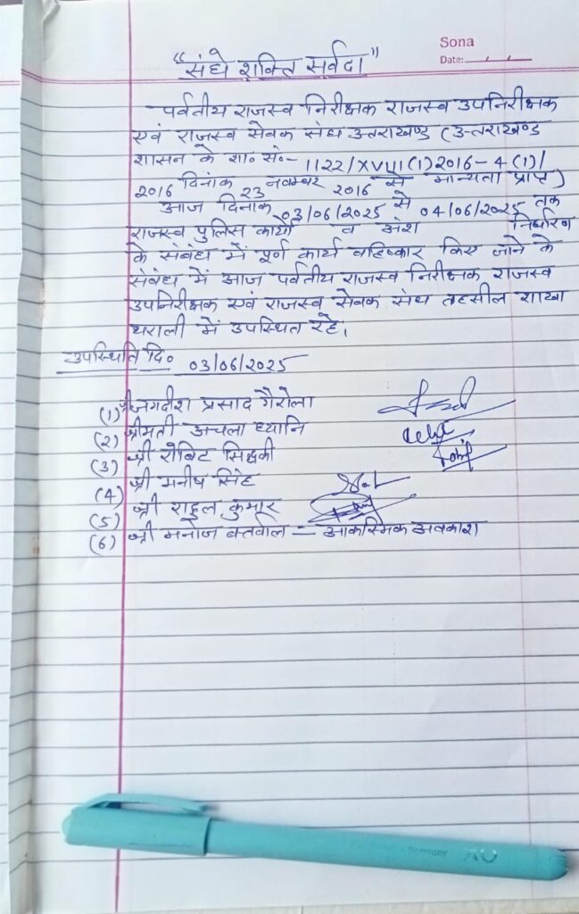 दो सूत्रीय मांगों को लेकर पर्वतीय राजस्व निरीक्षक, उप निरीक्षक, राजस्व अनुसेवक संघ के प्रांतीय आह्वान पर तहसील थराली में पर्वतीय तहसीलों के कानूनगो, पटवारी व राजस्व अनुसेवक दो द्विवसीय पूर्ण कार्य बहिष्कार में हैं।