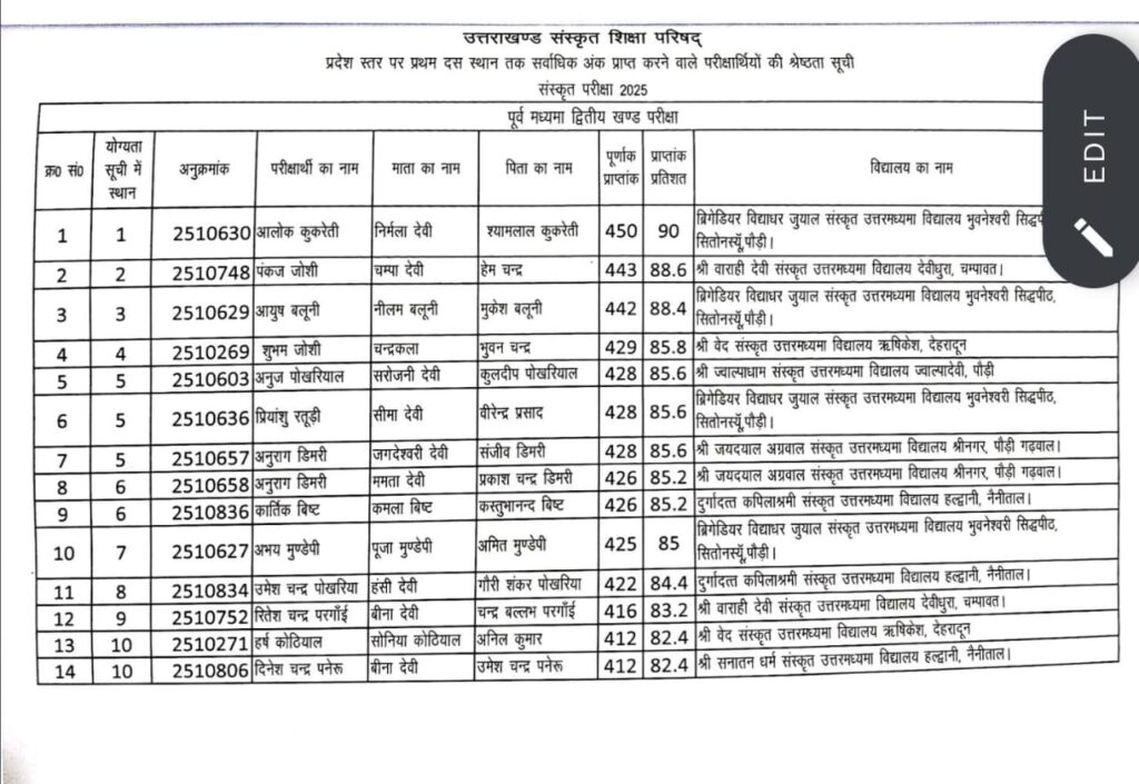उत्तरांचल संस्कृत शिक्षा परिषद 2025 की परीक्षा में शुभम जोशी ने पूर्व मध्यमा के द्वितीय वर्ष में पूरे प्रदेश भर में चौथा स्थान प्राप्त कर क्षेत्र का नाम रोशन किया है,शुभम जोशी ने परीक्षा में 500 में से 439 अंक प्राप्त कर 85.8 प्रतिशत अंक हासिल किए हैं।