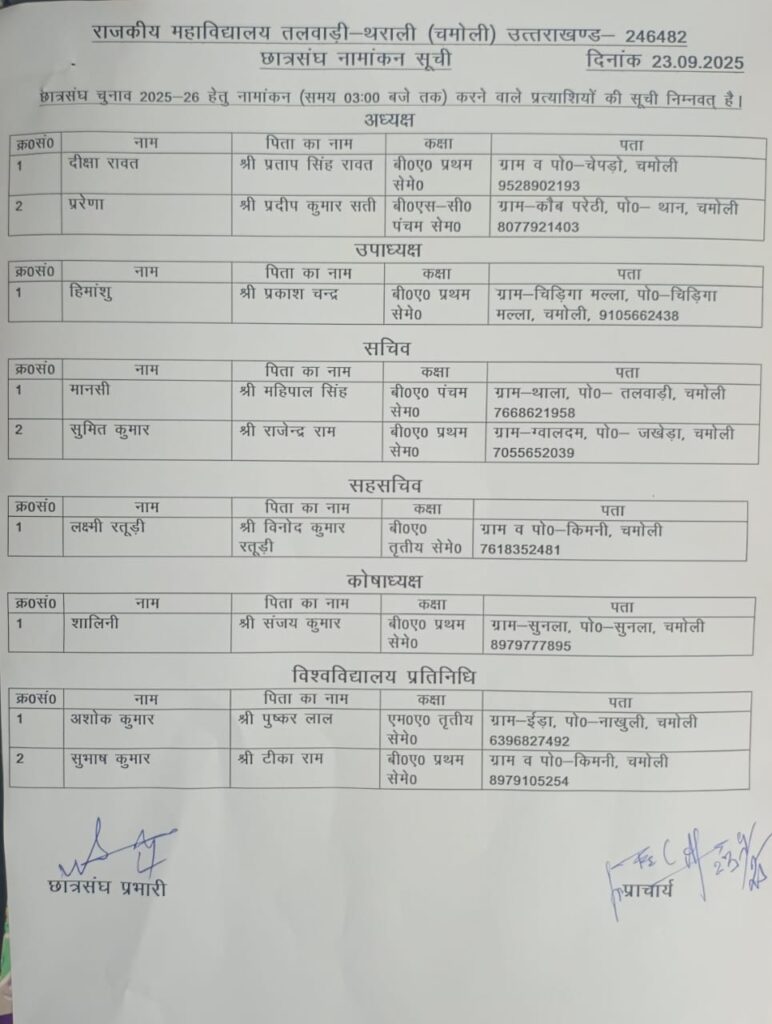 राजकीय महाविद्यालय तलवाड़ी में छात्रसंघ चुनाव में अध्यक्ष पद हेतु दीक्षा रावत पुत्री प्रताप सिंह रावत ( बीए प्रथम सेमेस्टर) और प्रेरणा पुत्री प्रदीप कुमार सती, (बीएससी पंचम सेमेस्टर) कुल दो नामांकन हुए है, उपाध्यक्ष पद पर हिमांशु पुत्र प्रकाश चंद्र (बीए प्रथम सेमेस्टर) एक ही नामांकन हुआ है, सचिव पद हेतु मानसी पुत्री महिपाल सिंह (बी ए पंचम सेमेस्टर) और सुमित कुमार पुत्र राजेंद्र राम (बी ए प्रथम सेमेस्टर) दो नामांकन हुए है, सह सचिव पद हेतु लक्ष्मी रतूड़ी पुत्री विनोद कुमार रतूड़ी (बी ए तृतीय सेमेस्टर) ने ही नामांकन किया हैं, कोषाध्यक्ष पद हेतु शालिनी पुत्री संजय कुमार (बी ए प्रथम सेमेस्टर) ने ही नामांकन किया है, विश्वविद्यालय प्रतिनिधि पद हेतु अशोक कुमार पुत्र पुष्कर लाल (एम ए तृतीय सेमेस्टर) और सुभाष कुमार पुत्र टीकाराम (बी ए प्रथम सेमेस्टर) दो नामांकन हुए है।